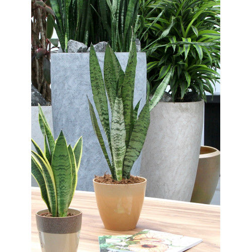 "De Sansevieria is een heel bekende kamerplant en wordt ook wel “vrouwentong” genoemd. Oorspronkelijk komen deze planten uit Afrika, Madagaskar en zuid Azië. De Zeylanica is een echte klassieke Sansevieria, met grote platte bladeren, alleen zonder een gele rand. Een Sansevieria is extreem makkelijk te verzorgen, doordat hij best wel even zonder water kan en niet heel veel eisen stelt aan zijn standplaats. Een perfecte plant dus voor iemand die vaak een periode weg is van huis, of voor de student die wel wat groen wil, maar niet zoveel bezig wil zijn met de verzorging ervan. Deze Sansevieria is ook een van de planten die de lucht in huis kan zuiveren! Dat betekent dat hij niet alleen CO2 omzet in zuurstof, maar dat hij ook allerlei schadelijke stoffen uit de lucht haalt. In tegenstelling tot de meeste planten, doet de Sansevieria dit voornamelijk s nachts. Perfect voor slaapkamers in woningen in de stad en voor huizen met weinig ventilatie! "
