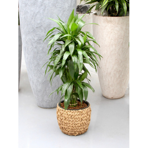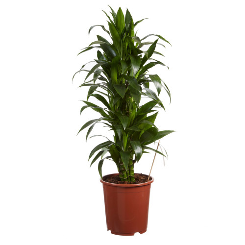 Geef snel een tropisch tintje aan je interieur met deze luchtzuiverende en makkelijk te verzorgen dracaena. De Dracaena deremensis Janet Craig heeft mooie donkere bladeren die lichtjes naar beneden hangen. Deze plant heeft meerdere stammen in een pot van 27cm diameter. Er zijn wel 120 verschillende soorten dracaena, waarvan sommige een bloedrode hars produceren. Daarom wordt hij ook wel drakenboom of drakenbloedboom genoemd. “Deremensis” is een synonym voor de soortnaam “Fragrans”. Deze naam heeft hij omdat er heel sterk geurende bloemen in kunnen komen. Thuis gebeurt dit trouwens bijna nooit! Een dracaena is heel makkelijk te verzorgen, doordat hij best wel even zonder water kan. Deze dracaena is ook een van de planten die de lucht in huis kan zuiveren! Dat betekent dat hij niet alleen CO2 omzet in zuurstof, maar dat hij ook allerlei schadelijke stoffen uit de lucht haalt. Perfect voor woningen in de stad en voor huizen met weinig ventilatie!